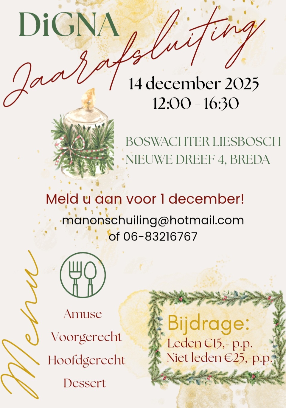 Sluit het jaar samen met ons af tijdens een sfeervolle middag van DiGNA. Op zondag 14 december komen we bij elkaar bij Boswachter Liesbosch in Breda voor een warme en ontspannen bijeenkomst met een volledig verzorgd menu. Een moment om elkaar te ontmoeten, bij te praten en samen vooruit te kijken naar het nieuwe jaar.